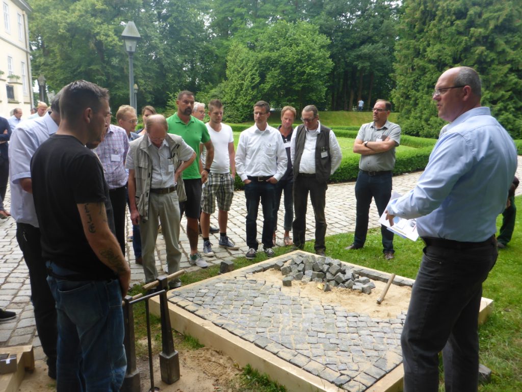Herr Straßenbauermeister Peter Borheck erläutert fachgerechte Ausführung von Natursteinpflasterarbeiten an Probeflächen